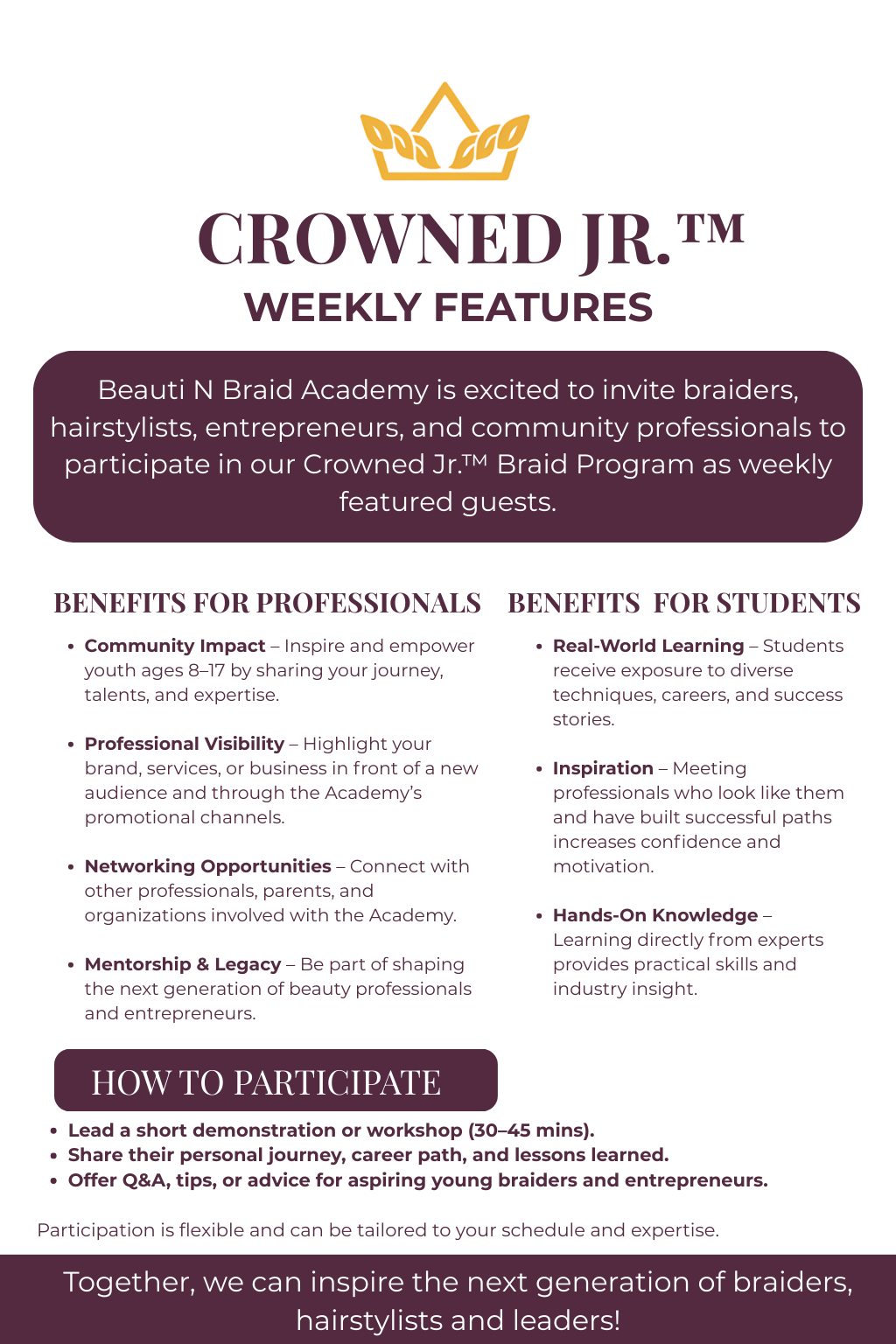 The Crowned Weekly Guest Feature is a special spotlight segment presented by The Beauti N Braid Academy that celebrates and highlights talented individuals, entrepreneurs, and community leaders who inspire through their creativity, culture, and impact. Each week, a new guest is featured to share their personal journey, professional expertise, or contribution to the beauty and braiding industry.